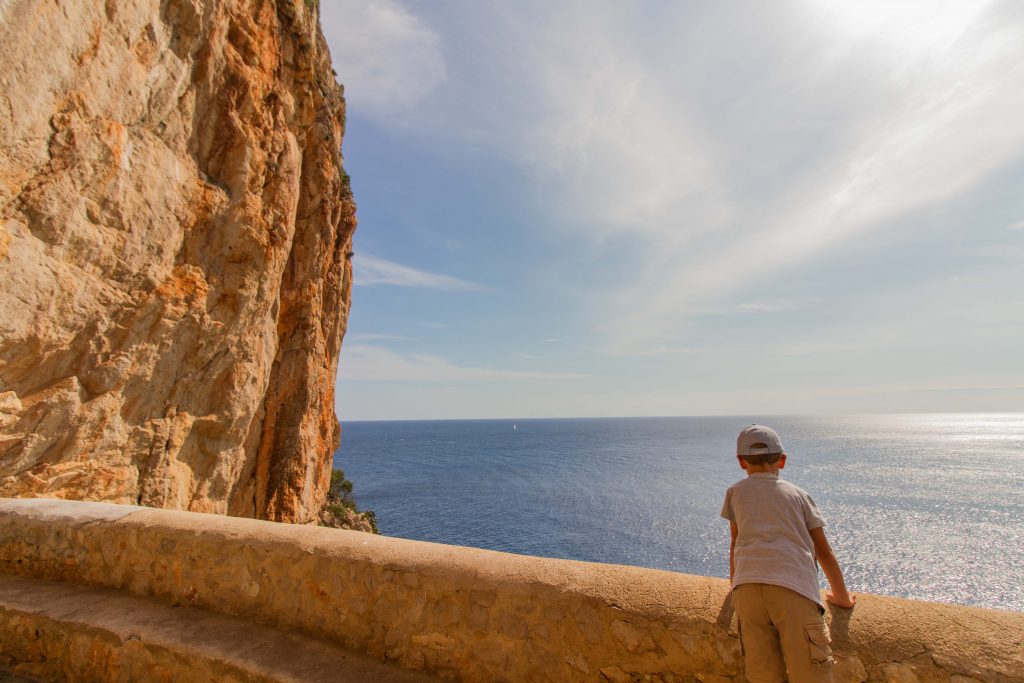 Kleinkind schaut auf das Mittelmeer bei Cala Rajada